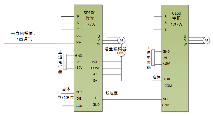 原收卷系統(tǒng)采用“變頻器+電機(jī)+磁粉+張力控制器”的模式,設(shè)備使用一段時(shí)間后需要對(duì)磁粉進(jìn)行維護(hù),且磁粉故障率較高,增加了廠家和客戶的故障點(diǎn)和維護(hù)成本;